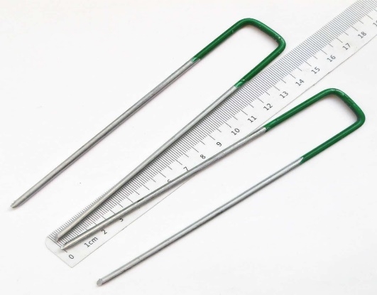 بالنسبة لقاعدة التربة، قم بتأمين العشب باستخدام مسامير مجلفنة على شكل حرف U ومسامير مستقيمة. قم بتثبيت المسامير على شكل حرف U عبر الحافة في التربة والمسامير المستقيمة حول المحيط. ضع المسامير على مسافة 1.5-2 متر.