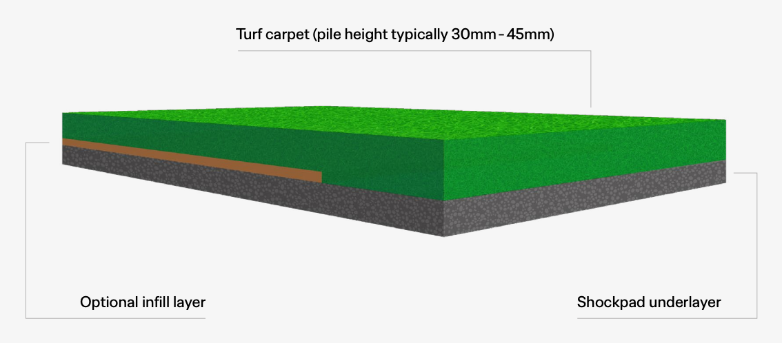 ارتفاع كومة العشب: توصية متوازنة بطول كومة يتراوح بين 30 إلى 45 ملم لتناسب احتياجات سلوك الكرة لكل من كرة القدم والهوكي، باستخدام حشو عالي الكثافة لمنع احتباس الكرة.