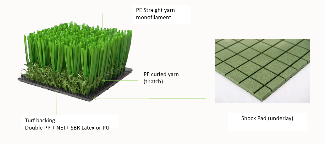 يتم وضعه على وسادة صدمات (اختياري ولكن يوصى به)، ولا يتطلب حشوًا رمليًا أو مطاطيًا مما يعني تركيبًا أسرع وصيانة أقل. تجعله الشفرات الأقصر مثاليًا للملاعب متعددة الرياضات وملاعب التدريب والملاعب الأصغر مثل مباريات 5 لاعبين.