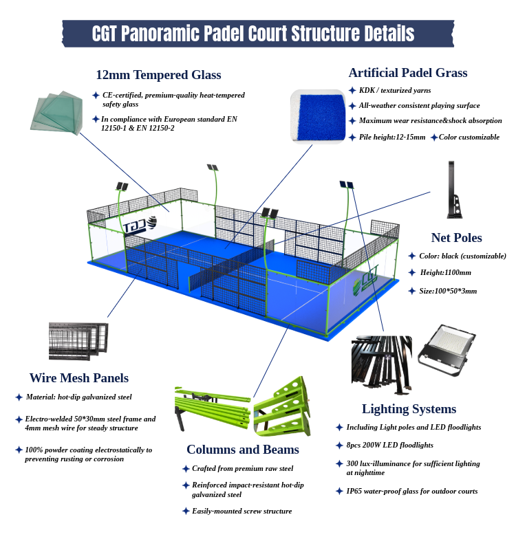 صُمم ملعب البادل البانورامي الفاخر من CGT ليجمع بين المتانة والسلامة والجمال. مصنوع من إطار فولاذي مجلفن بالكامل بتقنية الغمس الساخن، مما يوفر مقاومة ممتازة للتآكل والصدأ، مما يضمن أداءً طويل الأمد حتى في البيئات الخارجية القاسية.